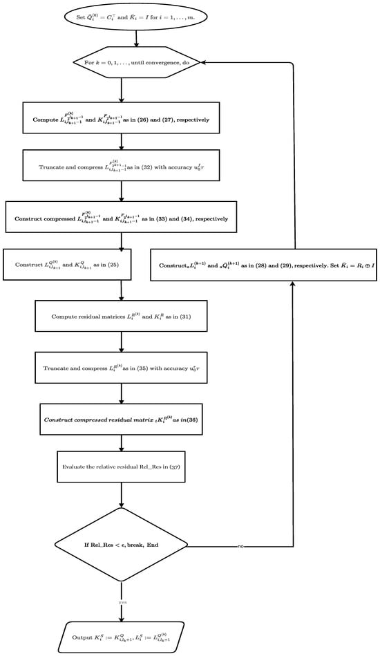 The key to applying Newton’s method to large-scale CDARE (1) lies in efficiently computing the solution of large-scale coupled Stein equations (CSEs). Recently, a novel operator Smith algorithm (OSA) was introduced for solving CSEs with SPSD constant matrices [20]. This method interprets the coupling unknowns as operator-valued expressions and employs a doubling strategy to accelerate the iteration, demonstrating well-behaved numerical performance on large-scale problems. Another approach to handling large-scale CSEs with low-rank structure is to represent the low-rank matrix in the HODLR structured form [21,22]. However, after performing matrix operations with sparse matrices, the HODLR-structured matrix requires restructuring; otherwise, the dense matrix will not be adapted to large-scale computations.