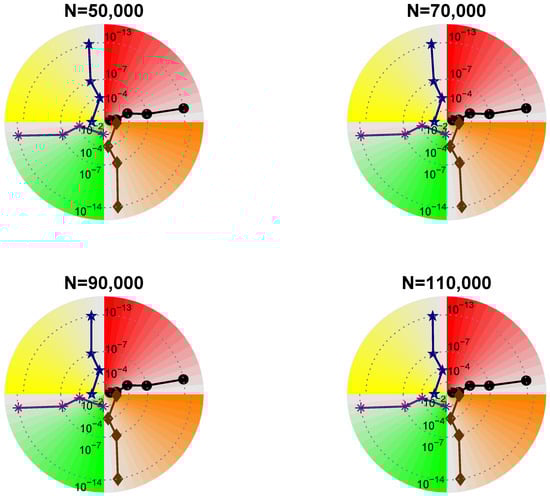 where and is estimated by ‘normest’ in Matlab. We take and for and and for . . In this experiment, we take and with and being random numbers in (0,1). Matrices , , and can be found at [27], or the MOR Wiki repository (https://morwiki.mpi-magdeburg.mpg.de/morwiki/index.php/Steel_Profile) (accessed on 30 July 2025). The probability matrix is defined as .