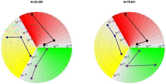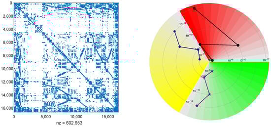 where random scalars are used for certain parameterizations, and the vector B has 392 nonzero elements, with a maximum entry of at most . Due to the structural similarity between and , only the sparsity pattern of is depicted on the left panel of Figure 3. Vectors and are mostly zero, with five nonzero entries located at rows (3341, 6743, 8932, 11,324, 16,563) for and (1046, 2436, 6467, 8423, 12,574) for , respectively. Full matrix data are available from [27] and at the MOR Wiki repository (https://morwiki.mpi-magdeburg.mpg.de/morwiki/index.php/Vertical_Stand) (accessed on 30 July 2025). For this example, we set and define the mode transition probability matrix as .