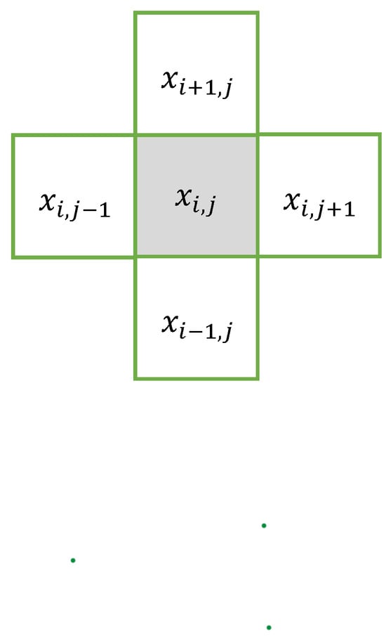 Now, we use a different way to explain the algorithm to enforce the L0 norm of the gradient image. For an image reconstruction task, we want to update the pixel , as shown in Figure 6. The horizontal and vertical gradients of pixel are , , and , , correspondingly. We want to minimize the L0 norms of these four differences. The derivative of these four L0 norms have this common expression: