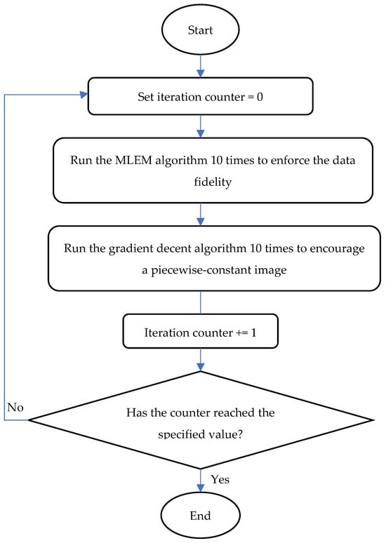 There are many algorithms to minimize the first term (i.e., the data fidelity term). We chose the maximum likelihood expectation maximization (MLEM) algorithm in our implementation [33,34,35,36,37]. On the other hand, the Bayesian term is minimized by a gradient descent algorithm. For an image reconstruction task, at the pixel , the gradient is given by (27).