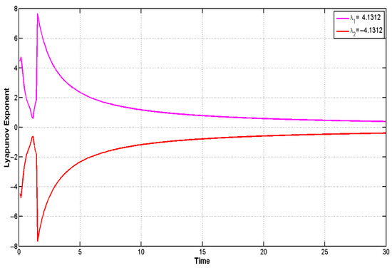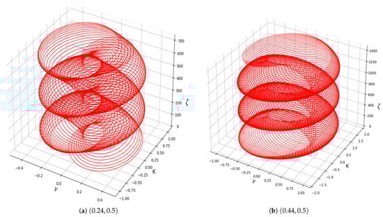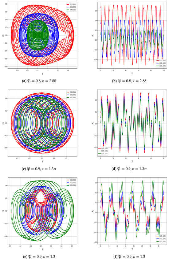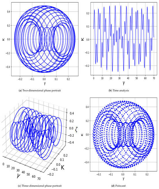 This section explores the emergence of multi-stability analysis in a system (23). The perturbed system demonstrates the capacity for multi-stability analysis, highlighting the coexistence of multiple dynamic behaviors for a given parameter set and varying initial conditions. Detection of chaotic behavior in system (23) through multi-stability analysis using , , , and as shown in Figure 15. The findings confirm that system (23) exhibits high sensitivity to initial conditions, leading to chaotic dynamics.