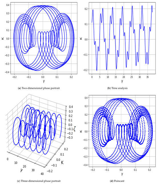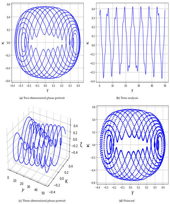 Nowadays, the study of dynamical behavior in nonlinear physical models has emerged as a prominent topic in nonlinear science. Bifurcation describes a topological and qualitative change in a system’s phase space caused by slight variations in parameters crossing critical thresholds [11]. It serves as a switching mechanism in many real-world systems, including neuron activation, pattern formation in morphogenesis, abrupt ecosystem shifts, and binary data storage in computers. Chaos describes the seemingly random yet deterministic behavior of nonlinear systems, highly sensitive to initial conditions. In continuous-time systems, chaos typically requires at least three nonlinear variables. Though governed by deterministic rules, chaotic systems exhibit unpredictable, non-repeating behavior, making long-term prediction difficult. Many researchers are actively exploring topics such as bifurcation and chaotic dynamics. For instance, San et al. [12] analyzed solitary waves of the fractional magneto–electro–elastic system. Jhangeer et al. [13] studied analytical solutions and dynamics of the extended Bogoyavlensky–Konopelchenko equation.