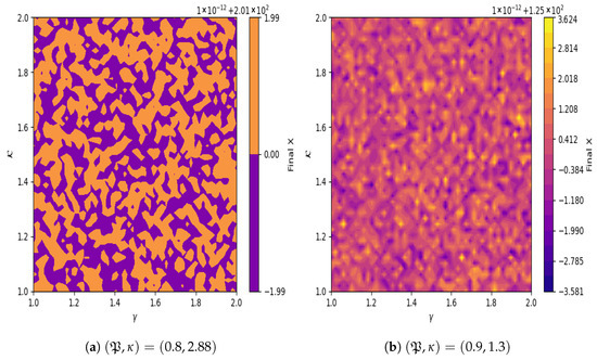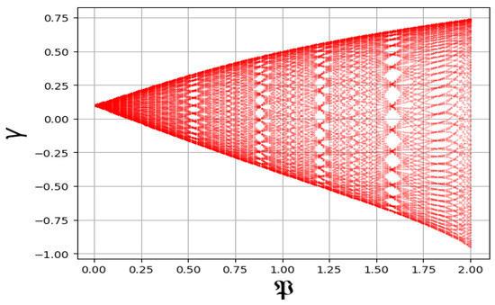 A Bifurcation diagram serves as an instrumental framework for examining dynamic systems and elucidating chaotic phenomena. It provides a visual representation of the modifications in a system’s behavior as a parameter undergoes variation, emphasizing the transition from ordered to chaotic dynamics. The diagram delineates the potential states of the system along the -axis while situating the parameter values on the -axis. Chaotic behavior is frequently characterized by intricate patterns, which may manifest as multiple branches or periodic windows. For the model described in Equation (12), the irregular patterns observed in Figure 12, under the parameter values , , , , and , indicate the presence of chaotic behavior.