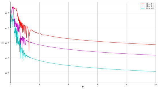 The Power spectrum represents a fundamental analytical instrument for the scrutiny of the frequency components of a signal, illuminating the patterns and periodic behaviors intrinsic within complex datasets. In practical applications, the Power spectrum fulfills critical roles such as filtering, spectral analysis, and noise alleviation [23]. In Figure 11, we analyze the Power spectrum behavior using the parameters , , , , , and , and three different initial conditions. All curves start from the same initial state, but their behavior changes at point value one; after this point, around 1.8, the curves exhibit symmetric behavior.