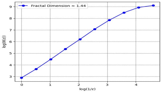 The Fractal Dimension quantifies the complexity of a geometric object by describing how the detail in the pattern changes with the scale at which it is measured. It is widely used to characterize Chaotic attractors in dynamical systems, analyze natural phenomena like coastlines or clouds, and study irregular patterns in physics, biology, and finance. This subsection presents the Fractal Dimension analysis of the chaotic system governed by , , , , , , and The plot of versus illustrates the scaling behavior of the trajectory, where represents the number of boxes needed to cover the attractor at resolution . The estimated Fractal Dimension is approximately 1.44, confirming the presence of chaotic dynamics and indicating a complex attractor structure, as shown in Figure 13.
