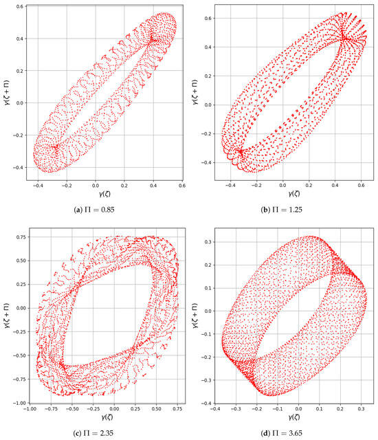 The Return map is an essential analytical technique for examining the dynamics of systems influenced by time delays. By plotting the correlation between and across various values of the delay parameter , one can gain valuable insight into the system’s temporal evolution [24]. Figure 14a–d presents this relationship for four different delays, , using fixed parameters , with and , and initial conditions .