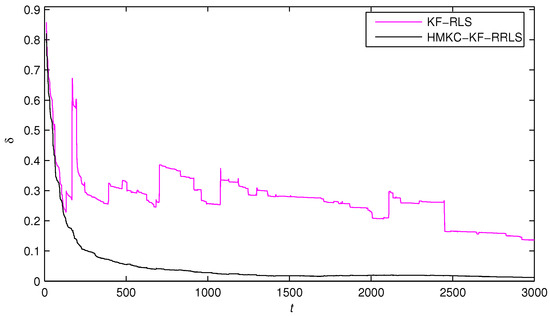 Take the data length , the Gaussian kernel bandwidth , the Versoria kernel parameter and the mixed coefficient . To facilitate observation of the influence of noises on parameter estimation, the noise variances and the contamination degree are taken as the same values, i.e., , and (). Based on the first 3000 samples, Table 1 and Figure 2 give the GVMKC-KF-RRLS parameter estimate and the estimation error . Meanwhile, to show the advantages of the GVMKC-KF-RRLS method, under the same noise environment, Table 1 and Figure 2 compare the GVMKC-KF-RRLS method with the KF-RLS method. As is illustrated, although the parameter estimation error of the KF-RLS method is overall decreasing over the instant k, there are some significant fluctuations on the parameter estimation curve. This is because the quadratic criterion function of the KF-RLS method amplifies the error and is sensitive to non-Gaussian noise. In contrast, the GVMKC-KF-RRLS parameter estimation error curve smoothly decreases as k increases. This indicates that the GVMKC-KF-RRLS method has the ability to resist non-Gaussian noise.