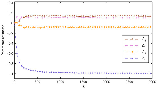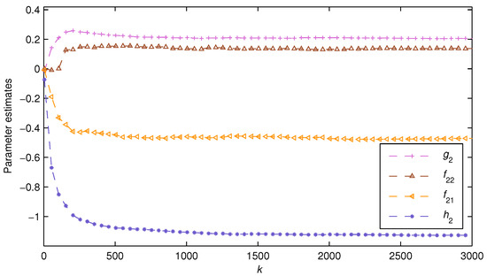 Figure 3 and Figure 4 show the parameter estimates , , , , , , and versus the instant k. It can be found that as k increases, all the parameter estimates gradually approach and reach their true values.