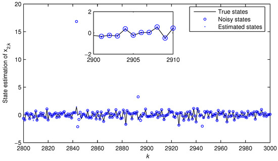 To visually verify the effectiveness of the GVMKC-KF-RRLS method for the state estimation, Figure 5 and Figure 6 show the true state , the noisy state and the estimated state () of the GVMKC-KF-RRLS method from 2800 to 3000, where the true state is computed by