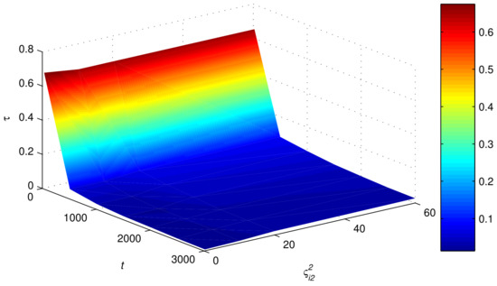 When the non-Gaussian measurement noise is encountered, in (2) grows sharply and the weighted norm increases; thus, in (31) decreases and increases, which results in the gain decreasing and the posterior state estimate remains unchanged with the prior estimate . Similarly, when the bilinear system suffers from the non-Gaussian process noise , the gain also remains unchanged. Therefore, the GVMKC-KF method can provide the robust state estimation of both the non-Gaussian measurement noise and the non-Gaussian process noise .