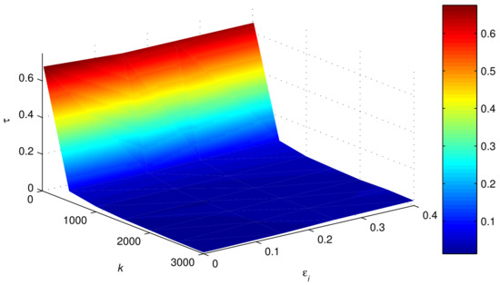 To illustrate the influence of non-Gaussian noise on the parameter estimation, Table 2 and Table 3, and Figure 7 and Figure 8 show the GVMKC-KF-RRLS parameter estimates and errors under different noise variance and different contamination degree , respectively. As can be observed from Figure 7, when the noise variance is fixed, the parameter estimation errors quickly decrease as k grows. When the instant k is fixed, the estimation errors show a minor change with increase in the noise variance . It can also be seen from Figure 8 that similar cases occur. For example, as the contamination degree alters, the GVMKC-KF-RRLS estimation errors show little change under the same data length. These phenomena show that the GVMKC-KF-RRLS method is robust to variation in a non-Gaussian noise environment. In addition, it can be inferred from Figure 7 and Figure 8 that the GVMKC-KF-RRLS method maintains high estimation accuracy when and , which indicates that the GVMKC-KF-RRLS method is effective in both non-Gaussian and Gaussian noise environments.