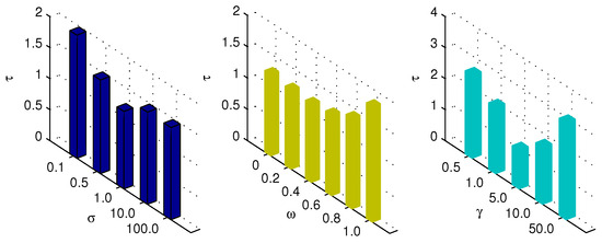 To demonstrate the robustness of the GVMKC-KF-RRLS method to the choice of key kernel hyperparameters, a sensitivity analysis is carried out by comparing the GVMKC-KF-RRLS parameter estimation errors under different kernel hyperparameters (the bandwidth , mixing coefficient and Versoria parameter ). As can be seen from Table 4 and Figure 9, when the bandwidth varies from 0.1 to 100 ( and are fixed), the GVMKC-KF-RRLS parameter estimation errors change very little and always remain below . The cases are similar when the mixing coefficient and Versoria parameter vary. This indicates that the GVMKC-KF-RRLS method is not sensitive to variations in the kernel hyperparameters , and , and that introduction of the Gaussian–Versoria heterogeneous kernel correntropy increases the robustness of the parameter estimation. Moreover, it can be seen from Figure 9 that the parameter estimation errors with and 0.60 are lower than those with and 1.00, which shows that introduction of the Gaussian–Versoria heterogeneous kernel correntropy in the GVMKC-KF-RRLS method can improve parameter estimation accuracy.