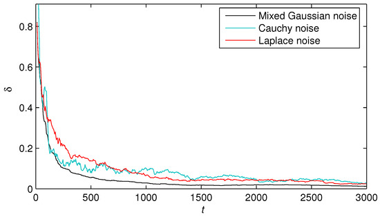 The GVMKC-KF-RRLS method is applied to identify the bilinear system under these three types of non-Gaussian noise environments, respectively. For fairness, the kernel hyperparameters of correntropy are taken to be the same in the three noise environments, i.e., the bandwidth , mixing coefficient and Versoria parameter . Table 5 and Figure 10 show the parameter estimation errors under three different kinds of non-Gaussian noise interferences (when the non-Gaussian noise is a mixed Gaussian one, the GVMKC-KF-RRLS parameter estimation errors are the same as those in Table 1). As can be observed, all the parameter estimation curves decrease as k increases, and the parameter estimation error is below when k reaches 3000. This indicates that the GVMKC-KF-RRLS method can effectively suppress outliers and maintain high estimation precision under the aforementioned three types of noises.