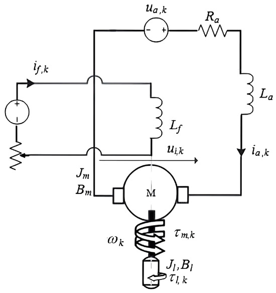 The equivalent circuit representation of the DC-motor and load is shown in Figure 11, where and are the load and motor viscous friction constant, and are the load and motor moment of inertia, and is the electromagnetic torque of the motor.