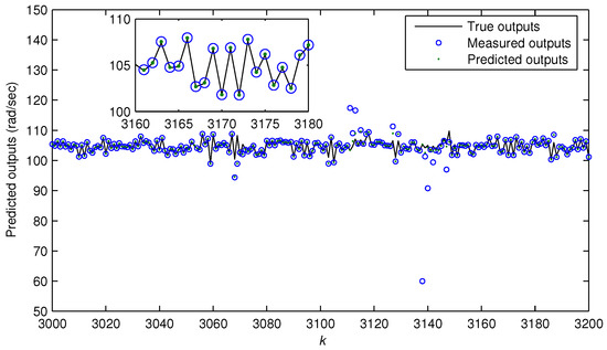 The sample interval is taken to be 0.01s and the forward Euler method is used to discretize the DC-motor system. The approximately mixed Gaussian noises , and are added into the state equation and the output equation, where . The control input is taken as a random signal uniformly distributed on and 3000 data are collected. It is assumed that the system model is in its observability canonical form. Since the state–space model is equivalent with its canonical form, the sampled data are the same. The GVMKC-KF-RLS method is applied to identify this example. Based on the obtained parameter estimates, another 200 data are collected and used for model validation. Figure 12 shows the simulation results. It can be observed that the estimated outputs closely match the true outputs, which indicates that the GVMKC-KF-RLS method can capture the practical system dynamics.