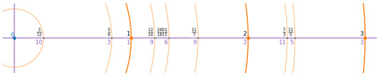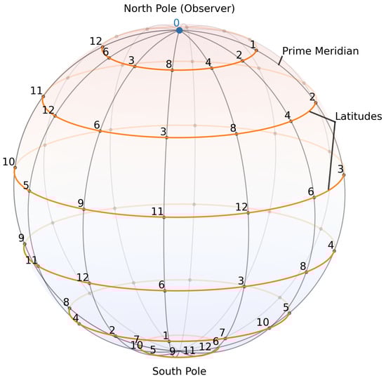 Correspondingly, the original additive sequence of the ring’s elements are represented as points located on the latitudinal axis—let us call it the prime meridian—of the 2-sphere , while the multiplicative symmetry elements are now arranged in circular patterns along the longitudinal axes and around the origin.
