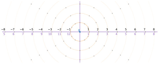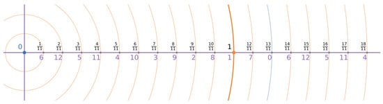 A typical diagram of a framed finite field , where , is shown in Figure 2. We would like to specifically note that such a diagram is typically visualized as a circle on a 2D plane spanned by the radial axis and rotational symmetry under the arithmetic operation of addition, thus assigning an intuitive geometric interpretation to the arithmetic structure of the additive group .
