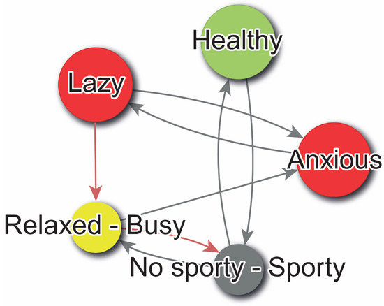 Directed graph representation of the personal construct system derived from the weight matrix W in Example (1). Each node corresponds to a bipolar construct, positioned and styled according to its psychological attributes. Node color encodes congruence with the Ideal-Self: green indicates full congruence (), red indicates discrepancy (), yellow marks undefined ideal values (), and gray indicates undefined self-perception (). Node size reflects the absolute self-score , representing the construct’s salience in current self-identity. Directed edges represent cognitive implications, with black denoting a direct relationship () and red an inverse relationship (). Edge thickness encodes the absolute weight , reflecting the strength of influence. This graph provides an interpretable structural summary of the Fuzzy Cognitive Map (FCM), supporting both visual intuition and algebraic analysis of psychological change dynamics. Graph generated using WimpTools [31].