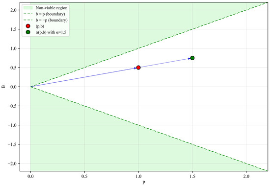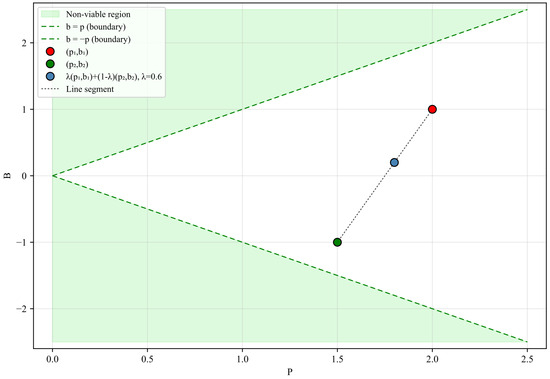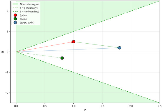 This section presents a formal characterization of the PB space. The analysis is organized into two parts. First, we demonstrate that the PB space satisfies the defining properties of a two-dimensional convex cone in . Second, we examine the projection as a limiting representation of all possible weighted directed graphs of increasing order n, assuming continuous-valued edge weights in the range .