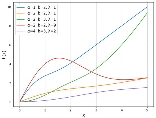 Figure 2 shows the HRF for the PWD non-monotone behavior. Non-monotone hazard rates can be used to model diseases or treatments where the risk of failure or relapse initially decreases, for example, the hazard rate may initially decrease during a recovery period, but later increase due to aging or long-term side effects. For certain products, the hazard rate might be high at the beginning due to early failures or manufacturing defects, then decrease or remain stable during a normal operating period, and finally increase again as the product ages, i.e., due to wear-out failures. During software testing, the failure rate might initially increase as issues are identified, then decrease as they are solved, but may spike again as new features are added. The proposed distribution is capable of modeling risks like forest fires or floods, where hazard rates can increase due to seasonal influences, then decrease, and possibly increase again due to external factors like climate change.