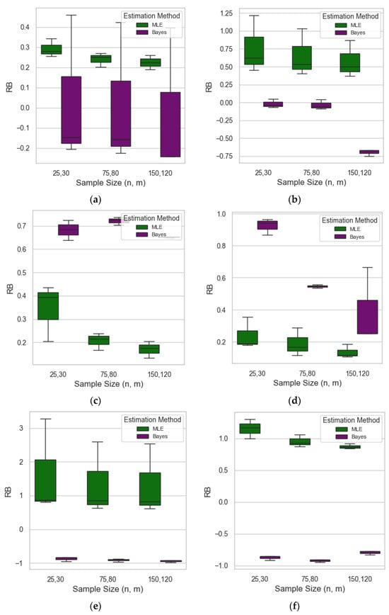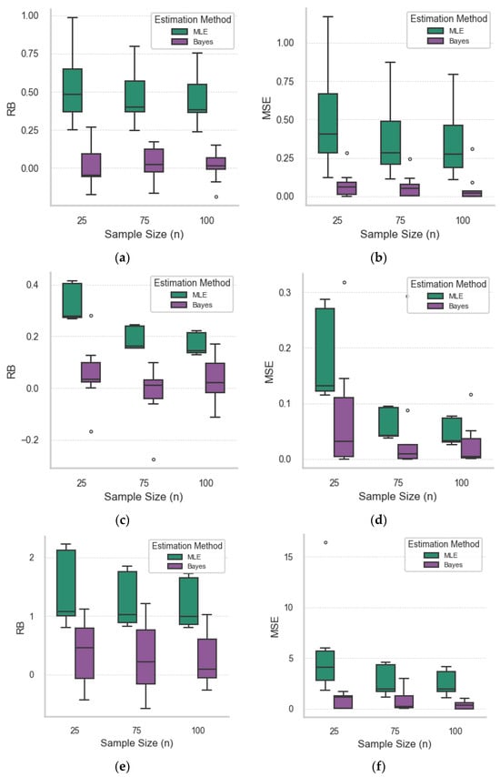In general, both MLE and Bayesian estimators show decreasing RB values as samples sizes increase, confirming the asymptotic unbiasedness of both methods. However, the Bayesian RB exhibits more variability, particularly in small samples and for parameters such as and . This reflects the impact of the prior information, which dominates in small samples, sometimes resulting in shrinkage or overcorrection. Parameters and consistently show high bias, particularly in Case 3. This is consistent with known limitations of PWD where likelihood surfaces for these parameters can be flat and poorly behaved. The plots in Figure 4e,f show that the Bayesian posterior for and sometimes concentrate below zero, violating the theoretical support of the distribution. This may reflect multimodality or numerical instability in posterior sampling.