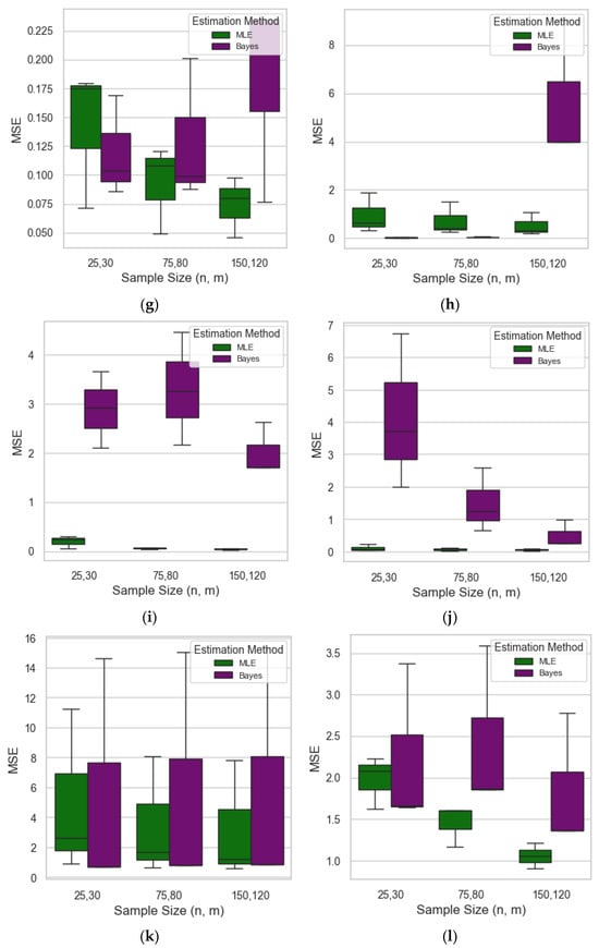 MSE generally decreases for larger sample sizes, as expected. For most parameters, Bayesian estimators outperform MLE in smaller samples due to the regularizing effect of the prior, especially for parameters and . However, Bayesian MSE remains volatile for -parameters, especially in Case 3. This suggests poor identifiability and posterior instability for those parameters under certain configurations of the stress–strength model. In a few cases (e.g., ) the Bayesian MSE starts higher but improves rapidly as sample size increases, becoming competitive or even better than MLE in medium-to-large samples.