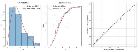 Fitted plots for PWD density (left), CDF (middle), and PP Plot (right).