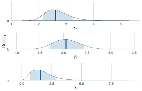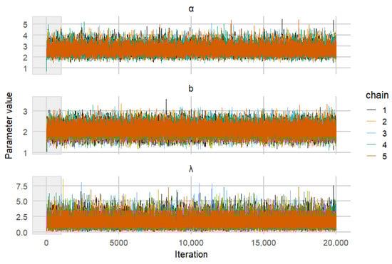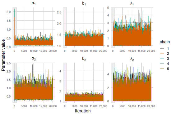 In addition to the trace plots, Figure 8 shows the histograms of the parameter estimates for the marginal posterior densities, based on values from five chains. These histograms allow the examination of the distribution of parameter estimates and assess their symmetry and consistency with the theoretical posterior density functions. The histograms in Figure 8 show that the posterior distributions are symmetric, further validating the reliability of the MCMC results.