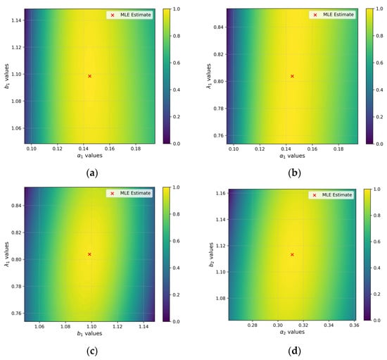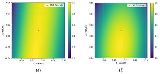 The contour plots shown in Figure 9 demonstrate that there is a unique solution for all parameters and . These plots indicate that all parameter estimates, except and , lie within the region of maximum likelihood.