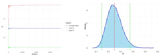 Figure 11(left) shows the cumulative mean, the lower confidence interval, and the upper confidence interval of the stress–strength reliability measure across iterations. The cumulative mean stabilizes around 0.25 after a few thousand iterations, indicating convergence. The upper and lower confidence intervals also stabilize, indicating consistent bounds.