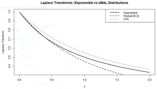 Comparing the Laplace transforms of the exponential, Weibull (UBAL case), and LFR distributions.