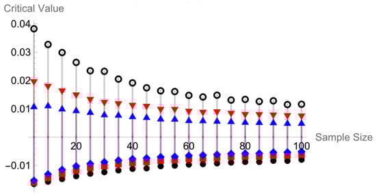 Once more, the 90%, 95%, and 99% percentage points of the test statistic in (12) are simulated for a few chosen values of s from the typical exponential distribution in Table 8 and Figure 6 below, based on 10,000 simulated and sample sizes of n = 2, 4, 6, …, 20, 30, 40, …, 100.