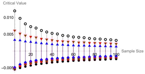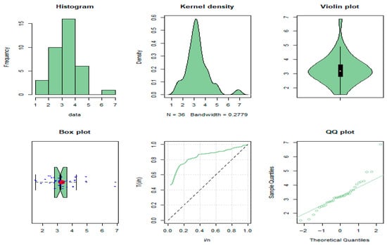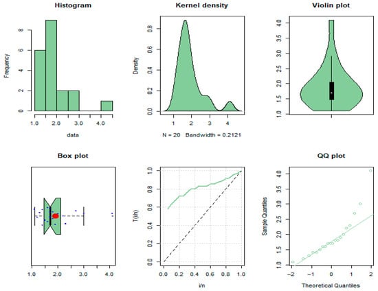 At , , the critical values = This value results in the acceptance of . Then, we reject the UBAL property of data and conclude that the data have the property (see Figure 9).