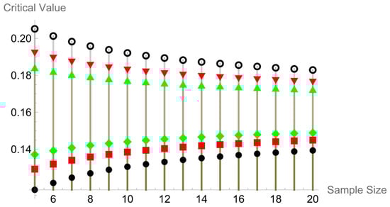 Bakr [] collected data on the survival times (in years) of 43 individuals diagnosed with a specific type of leukemia. In this instance, the critical value is 0.010595 as n = 43. We calculate the statistic in (6) 0.073664, which are both smaller than the critical values in