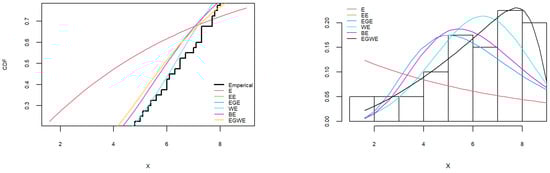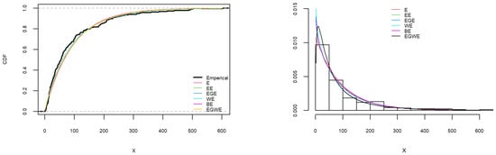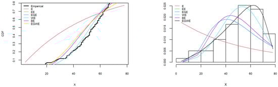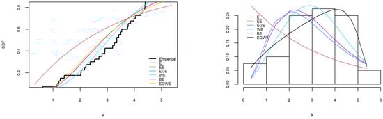 Table 3, Table 4, Table 5 and Table 6 display summaries of the MLEs of the parameters, as well as the log-likelihoods, AIC, AICc, and K-S statistic and its p-value for each model. It can be observed that the EGWE achieved the best performance, according to its maximum log-likelihood and p-value, and its lowest AIC and AICc, when compared with the other fitted distributions. The histograms of the data with plots of the estimated pdfs, as well as the fitted cdfs vs. empirical values for the datasets are displayed in Figure 2, Figure 3, Figure 4 and Figure 5 for each model. Comparing the pdf and cdf of the proposed distribution with those of the compared distributions, the EGWE distribution can be seen to more closely mimic the empirical pdf and cdf.
