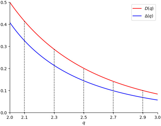 Figure 1 illustrates the behavior of the functions D and as functions of the parameter q over the open interval . The graphical representation provides insight into the variation in these expressions with respect to q, highlighting their respective growth trends.