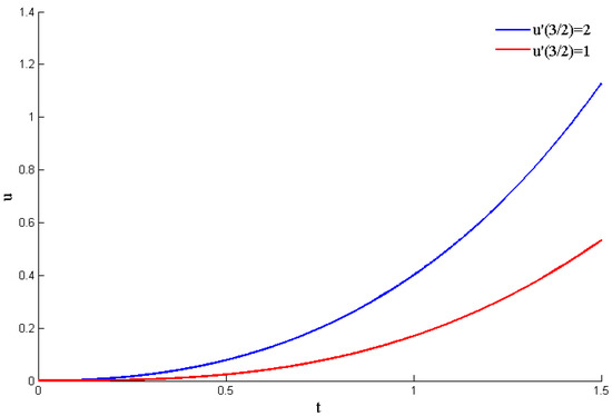 Figure 2 illustrates the solution to Problem (72) for the two cases and . The computations were performed using the bvp4c routine in Matlab, which is specifically designed for the numerical resolution of boundary value problems. This solver is based on a collocation method, employing the three-stage Lobatto IIIa formula [29,30], a fourth-order finite difference scheme that ensures both accuracy and stability in the approximation of solutions.