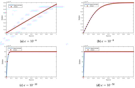 Consider Equations (2)–(4) with , . In Figure 2a–d, for various values of , , , and , a comparison between the exact and CBS solutions is displayed. Figure 3a–d, shows the surface plot of the NS for various values of . In Figure 4a,b, Comparison for , and is shown. In this case, , and . Each plot makes it clear that when the declines, the boundary layer becomes sharper. Figure 5 shows the surface plots for two different values of .