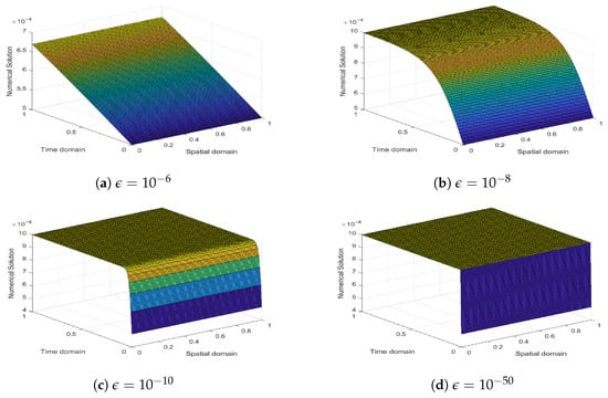 The solution of the generalized Huxley (GH) equation was suggested by Hashim et al. [3] using the Adomian decomposition method (ADM). Batiha et al. [4] employed the Variational iteration method (VIM) to simulate the GH equation. Sangwan et al. suggested a three-step Taylor Galerkin approach [5]. They examined how the HH equation behaved when . The boundary layer has been more sharply captured using the Shishkin mesh. The HH equation was solved by Aderogba and Chapwanya [6] using a positive and bounded nonstandard finite difference method (FDM). Macias-Díaz et al. [7] have presented a non-standard FDM to estimate the solution of an extended Burgers-Huxley (BH) equation. To solve the generalized BH equation, Sari et al. [8] combined a fourth-order Runge–Kutta approach with an up to tenth-order FDM. A uniform convergent technique with piecewise uniform mesh was introduced by Kaushik and Sharma [9] for the singularly perturbed unsteady generalized BH problem. This scheme combines the FDM and the Euler implicit method. Numerous other numerical methods, like VIM [10], the Galerkin method [11], etc., are developed to solve the HH equation.