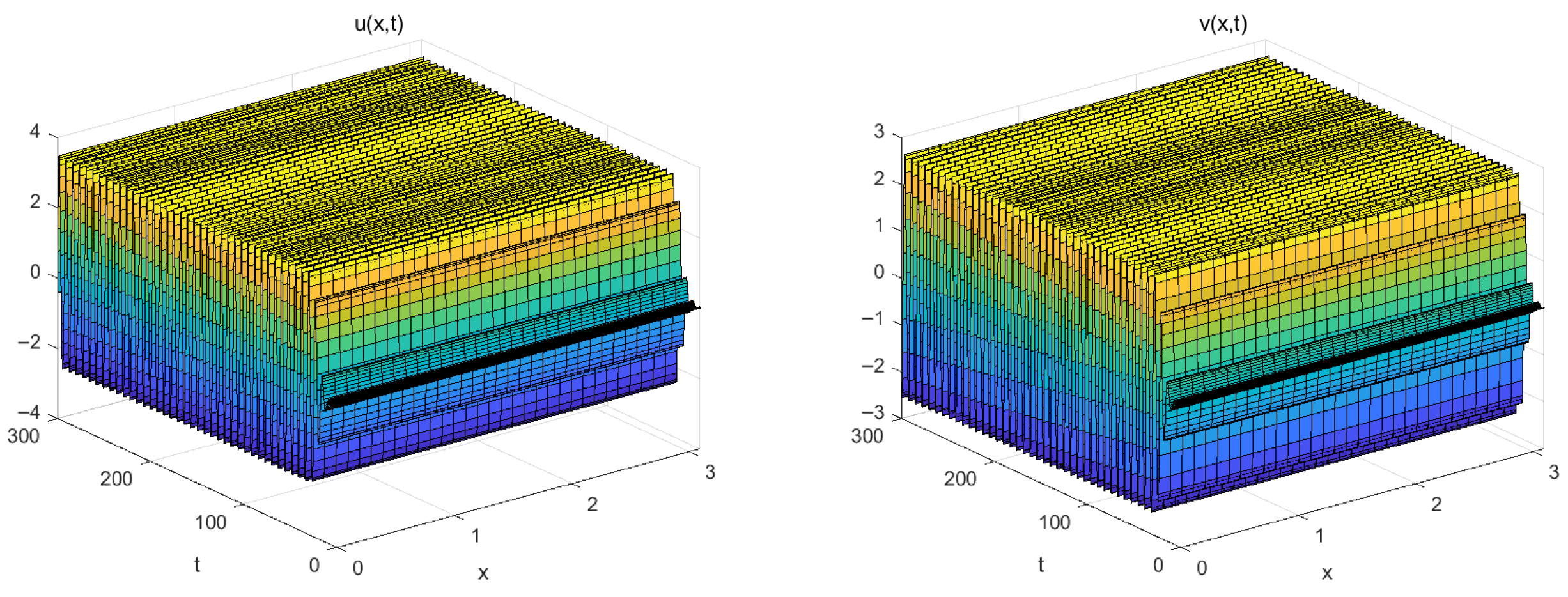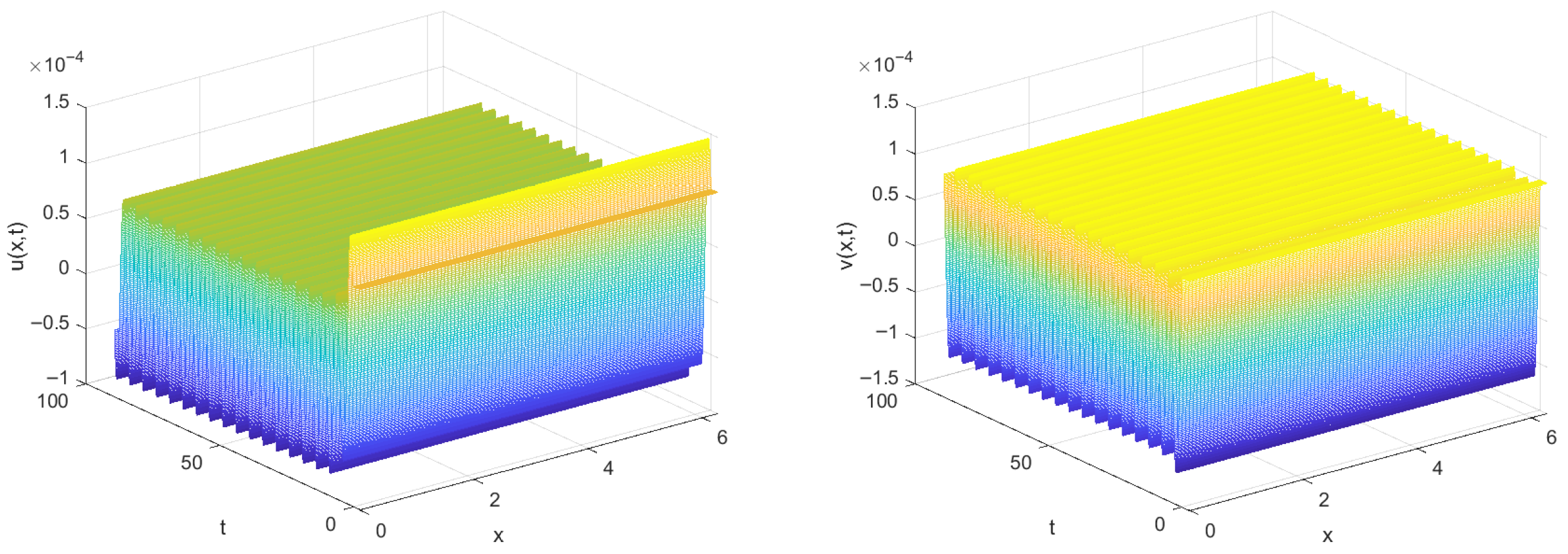 - (3) When , Hopf bifurcation occurs at , and the bifurcating periodic solutions are nonhomogeneous.