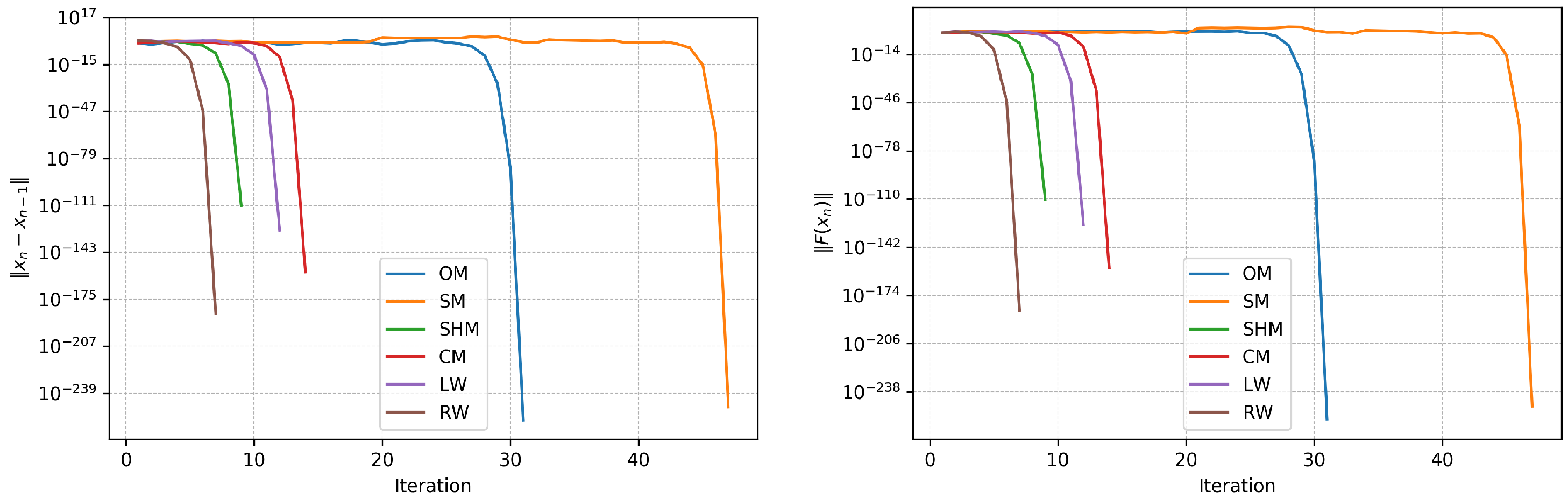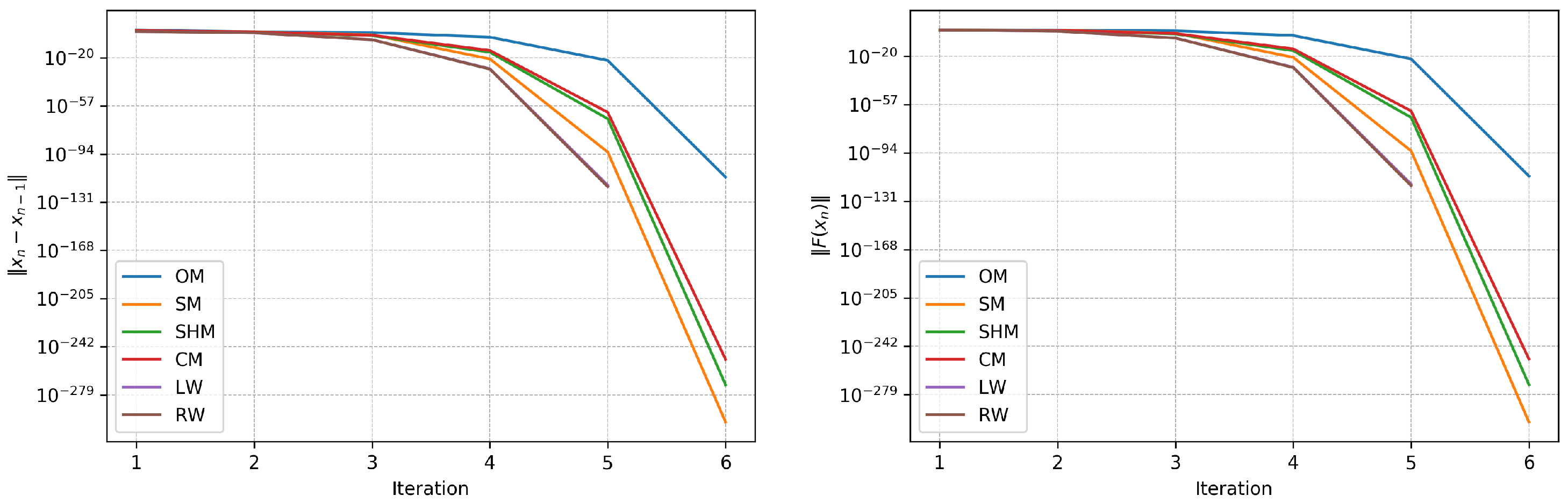 , against the iteration number. It is evident that the analyzed methods, LW (purple) and RW (brown), exhibit the fastest rate of decay (they coincide) and reach the required machine precision levels by the fifth iteration. In contrast, other algorithms require six iterations to converge, but all of them, except OM, achieve quite high precision. Overall, both plots corroborate the numerical results in