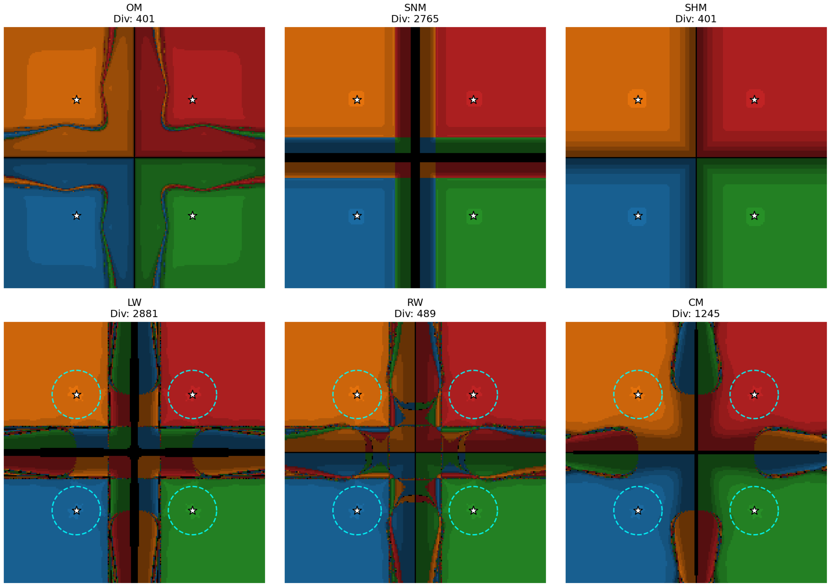 ), marked by cyan dashed circles for the analyzed family, is clearly visible and fully contained within the stable regions. The stability is quantitatively confirmed by the low divergence counts (Div). The Rational Weight (RW) method exhibits excellent stability with only