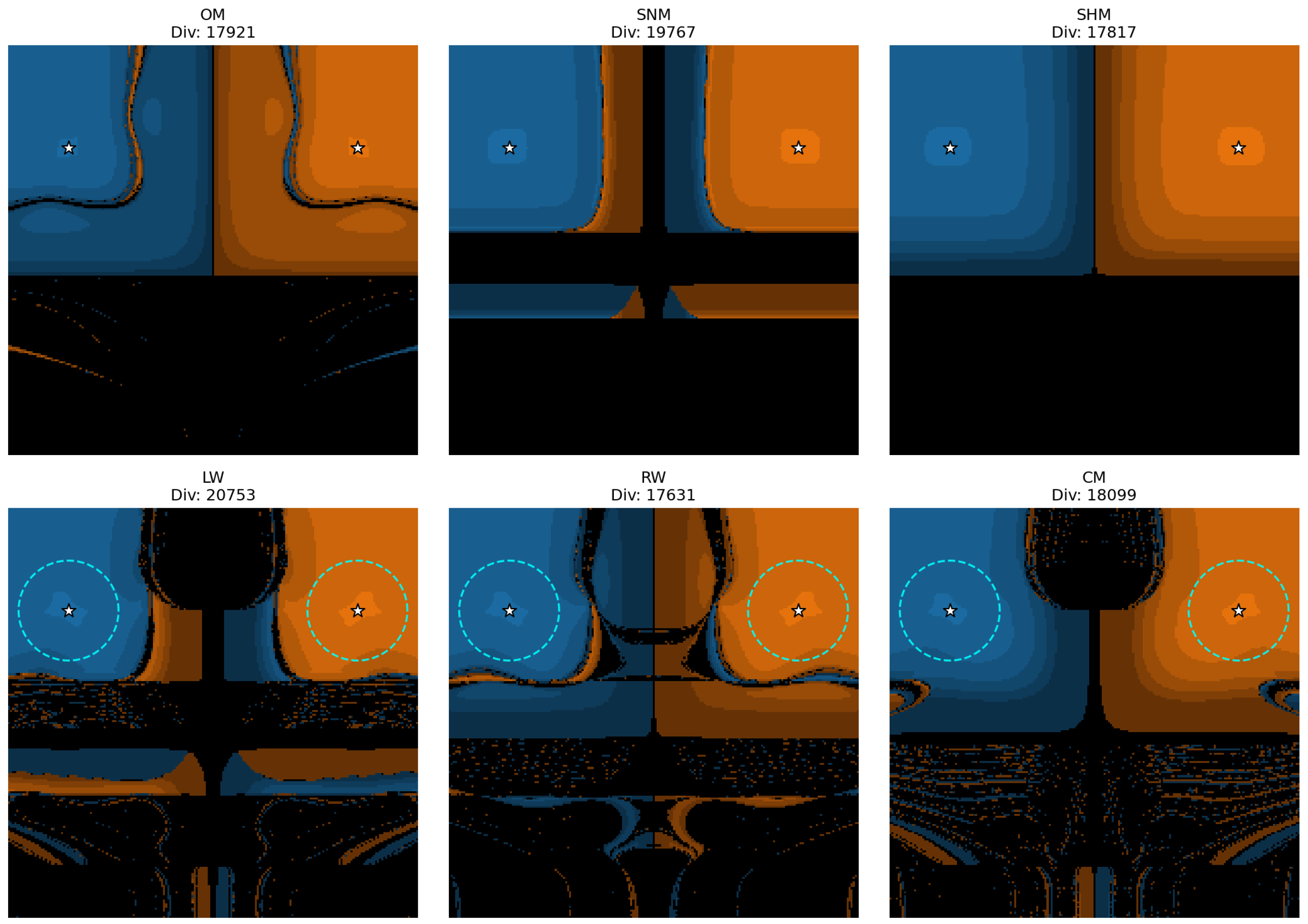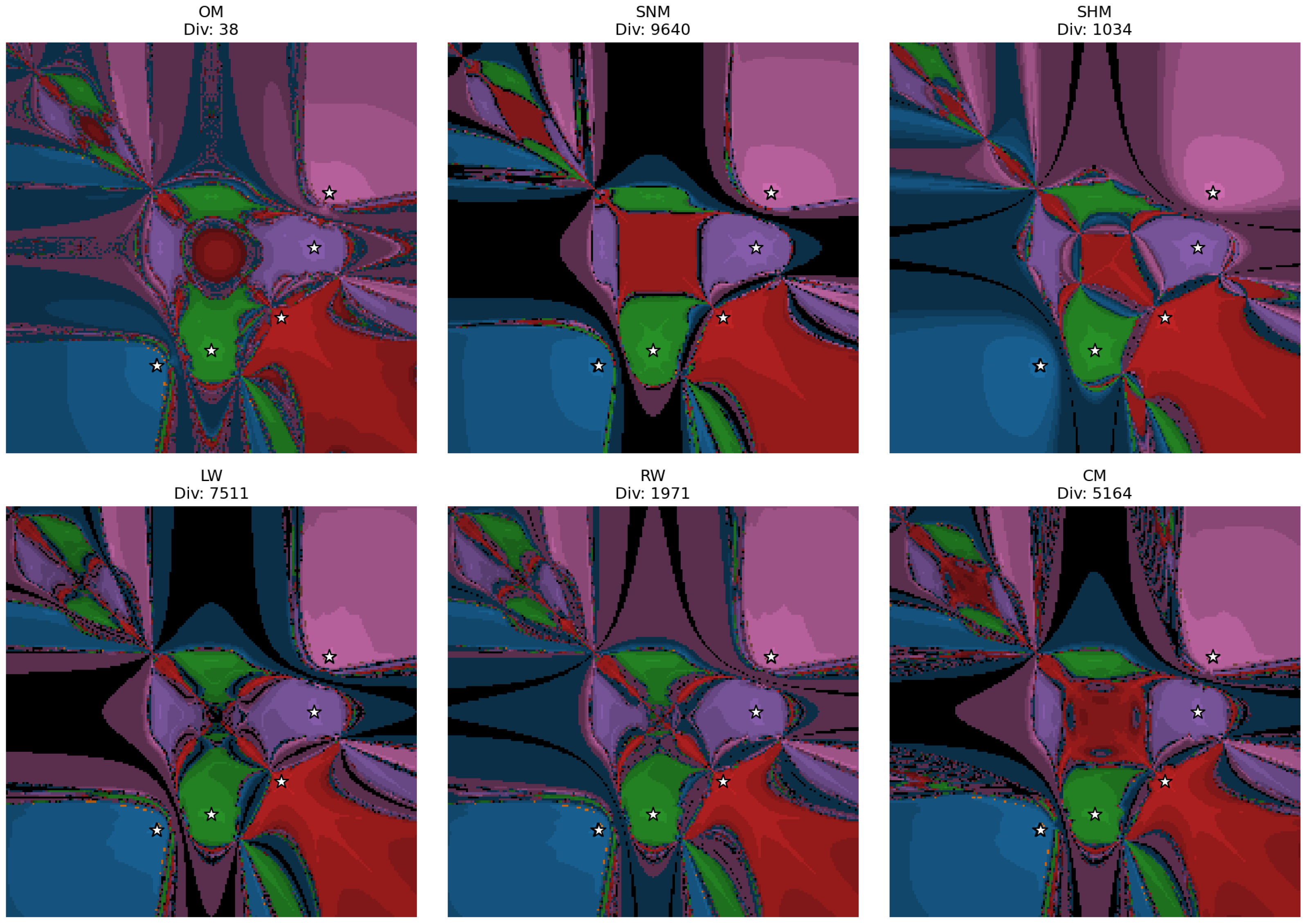 Across all three examples, OM is the most stable method, but it has fewer bright areas than the parametric family, indicating slightly slower convergence. The RW method exhibits larger bright areas and fewer divergent points, representing the best trade-off between speed and stability. Additionally, the methods RW, LW, and CM display similar shapes across all examples.