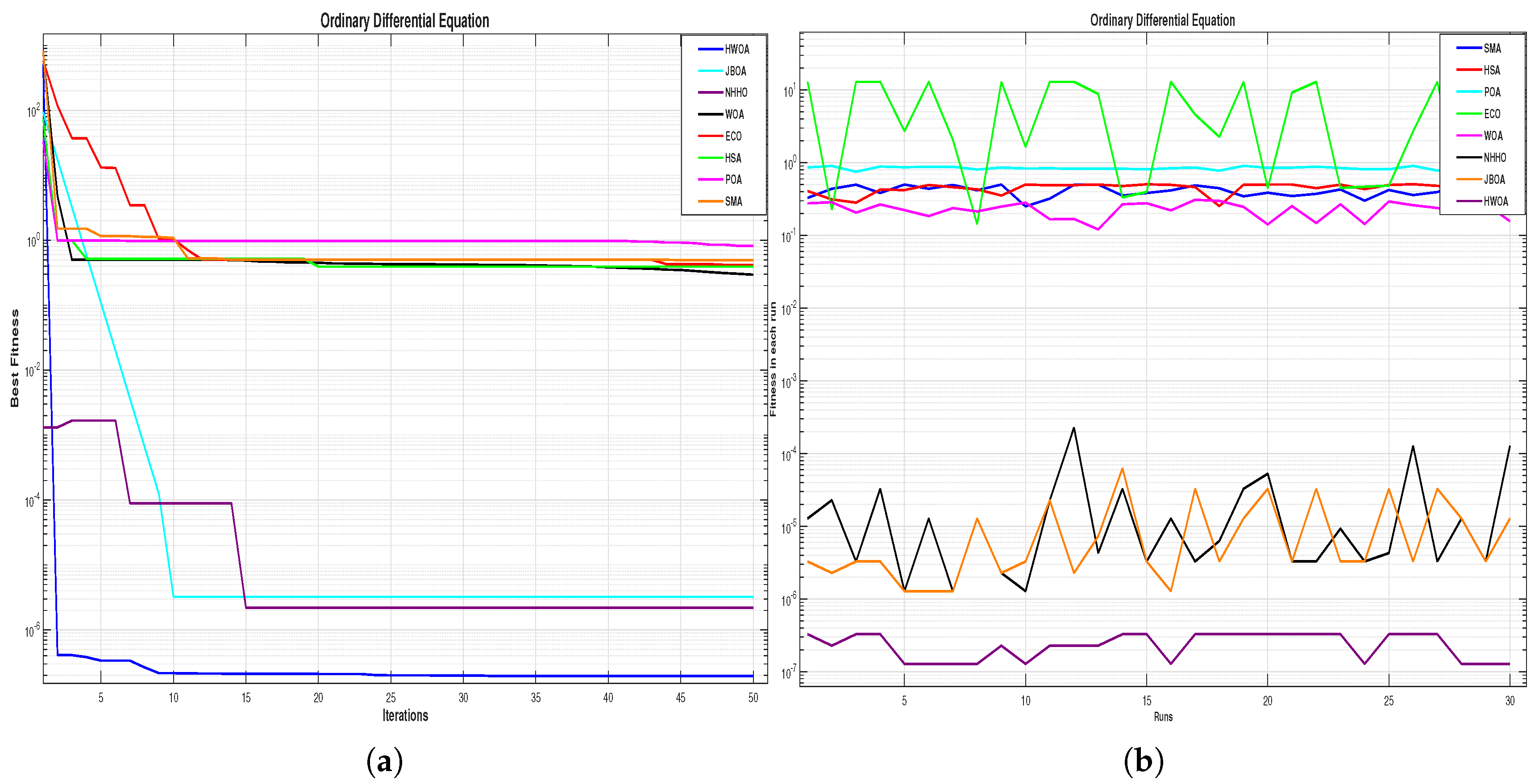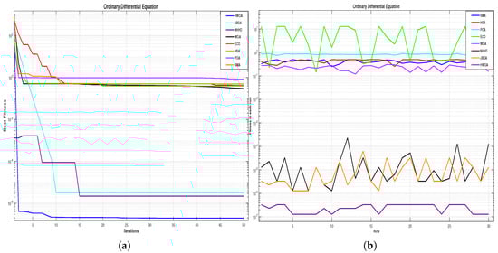 Figure 5, the graphical analysis of convergence, iterations, and 30-run convergence results of different methods for the application of ordinary differential equations is presented.