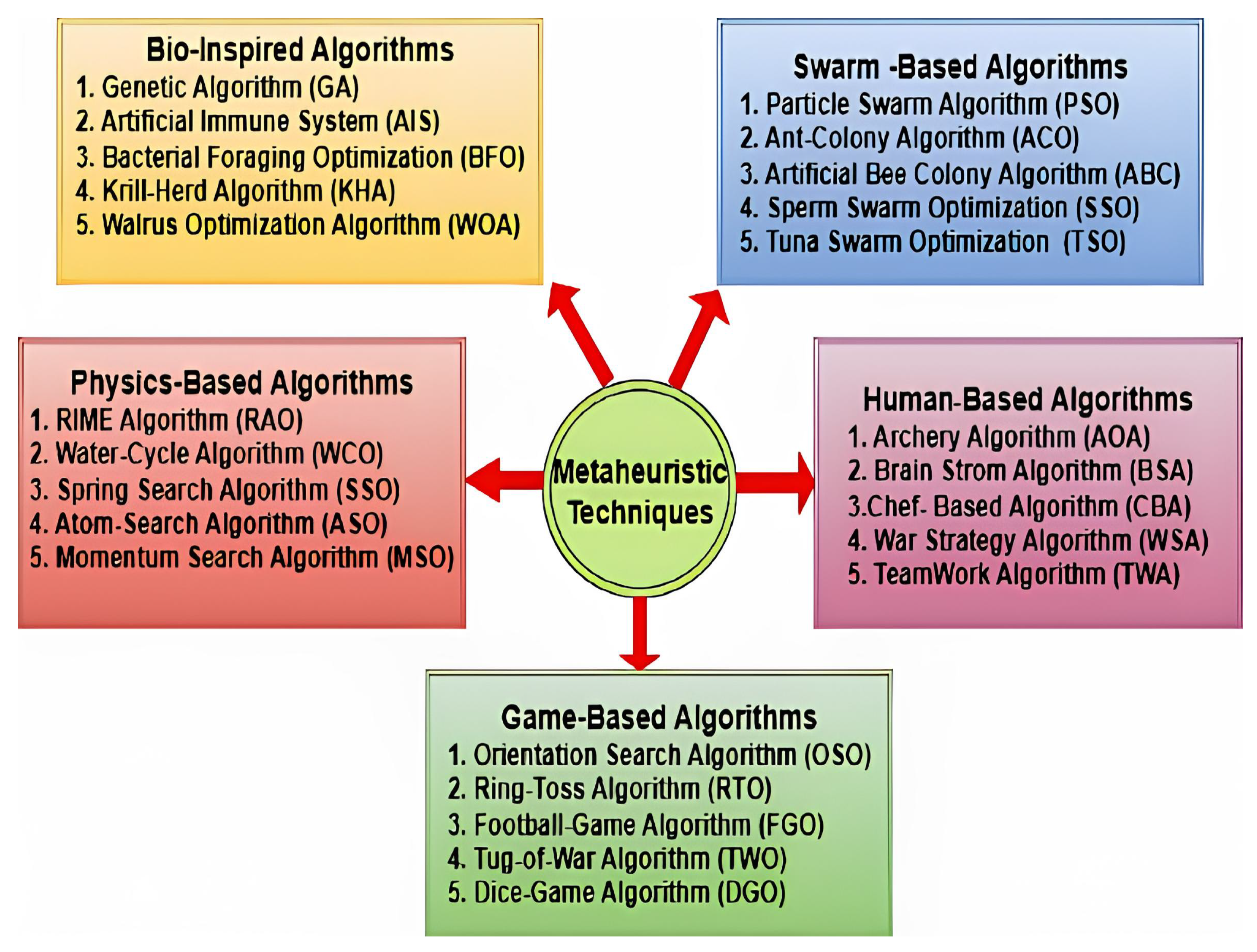 1]. From the perspective of their primary inspirational source, these algorithms are classified into five distinct categories highlighted in