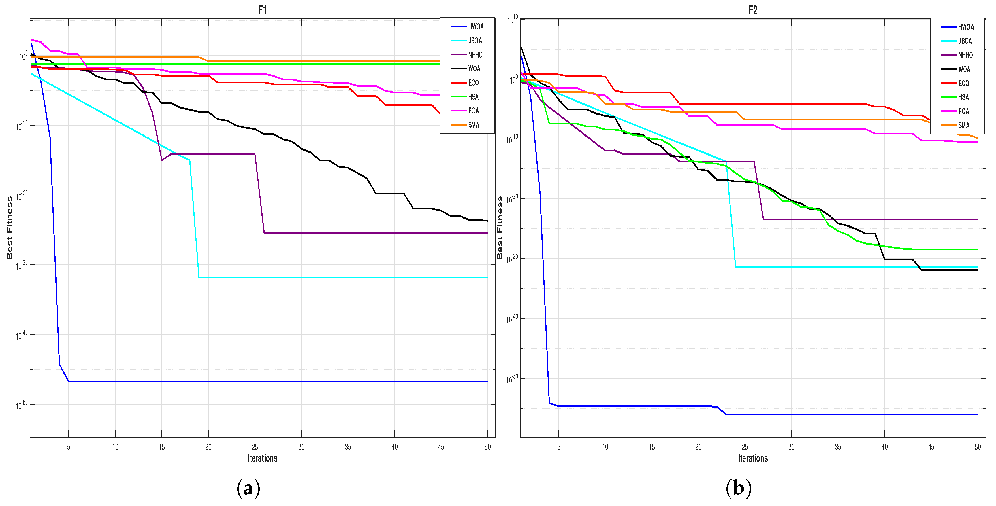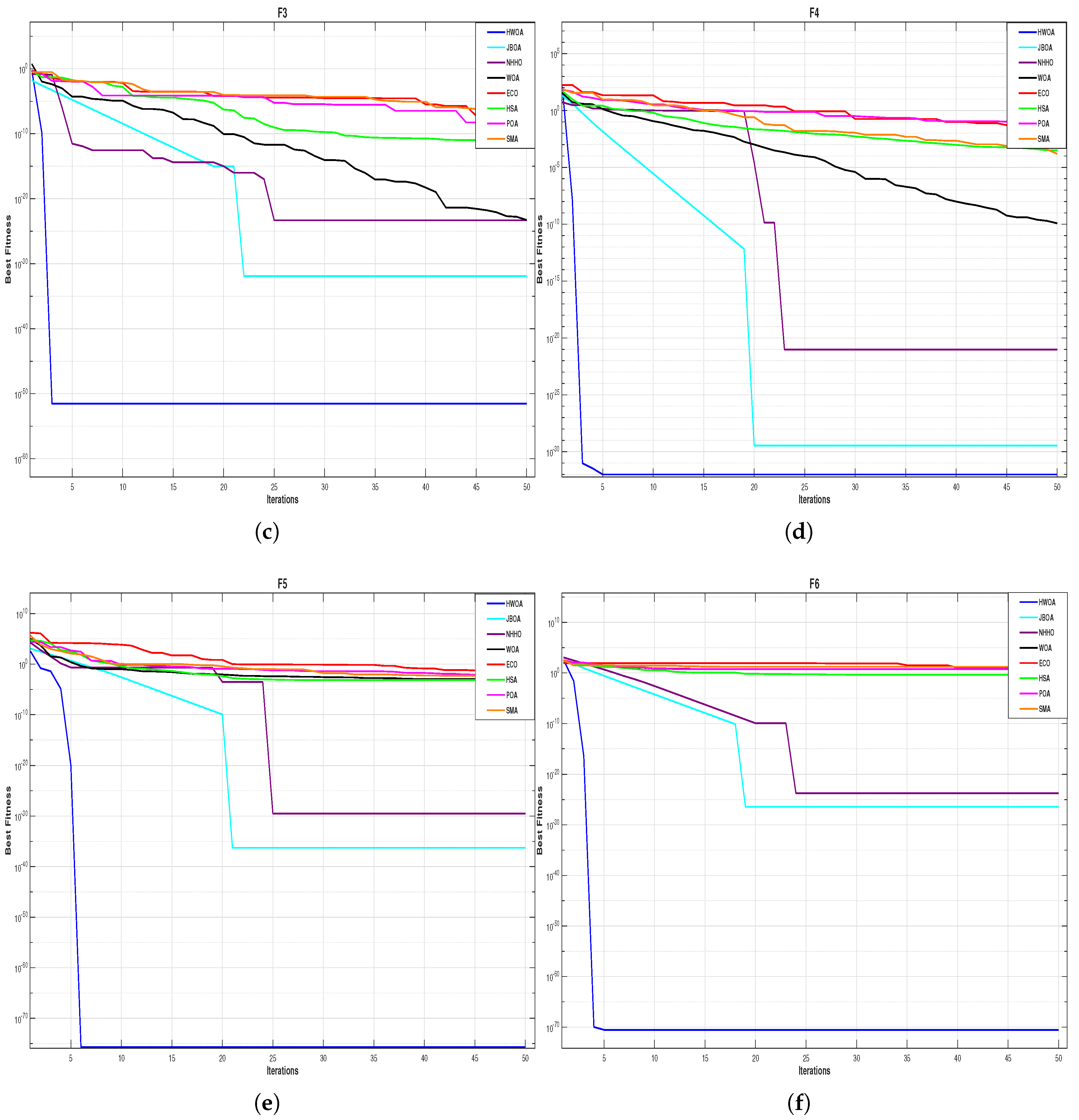 Table 4 depicts that the iterative scheme diverges at the initial point when it is not near to the root and does not provide an accurate solution to the test function. And if it converges to a solution, the fitness is much lower. On the other hand, when it comes to the proposed scheme HWOA, it is not necessary to provide the initial guess. This is performed through a meta-heuristic method that is applied in developing the proposed method. In addition, the iterative scheme can minimize the functional error to significant levels provided we increase the level of precision of the results. But that will increase the computational cost of the scheme. The results for all the problems indicate the efficiency of the proposed method HWOA over other traditional meta-heuristic approaches as well as the standalone iterative technique, as the proposed method requires a lower number of iterations and less CPU time to produce the best optimal roots.