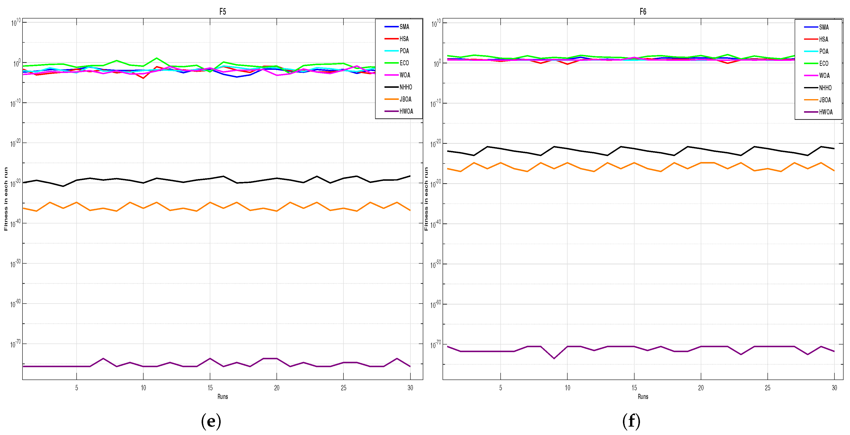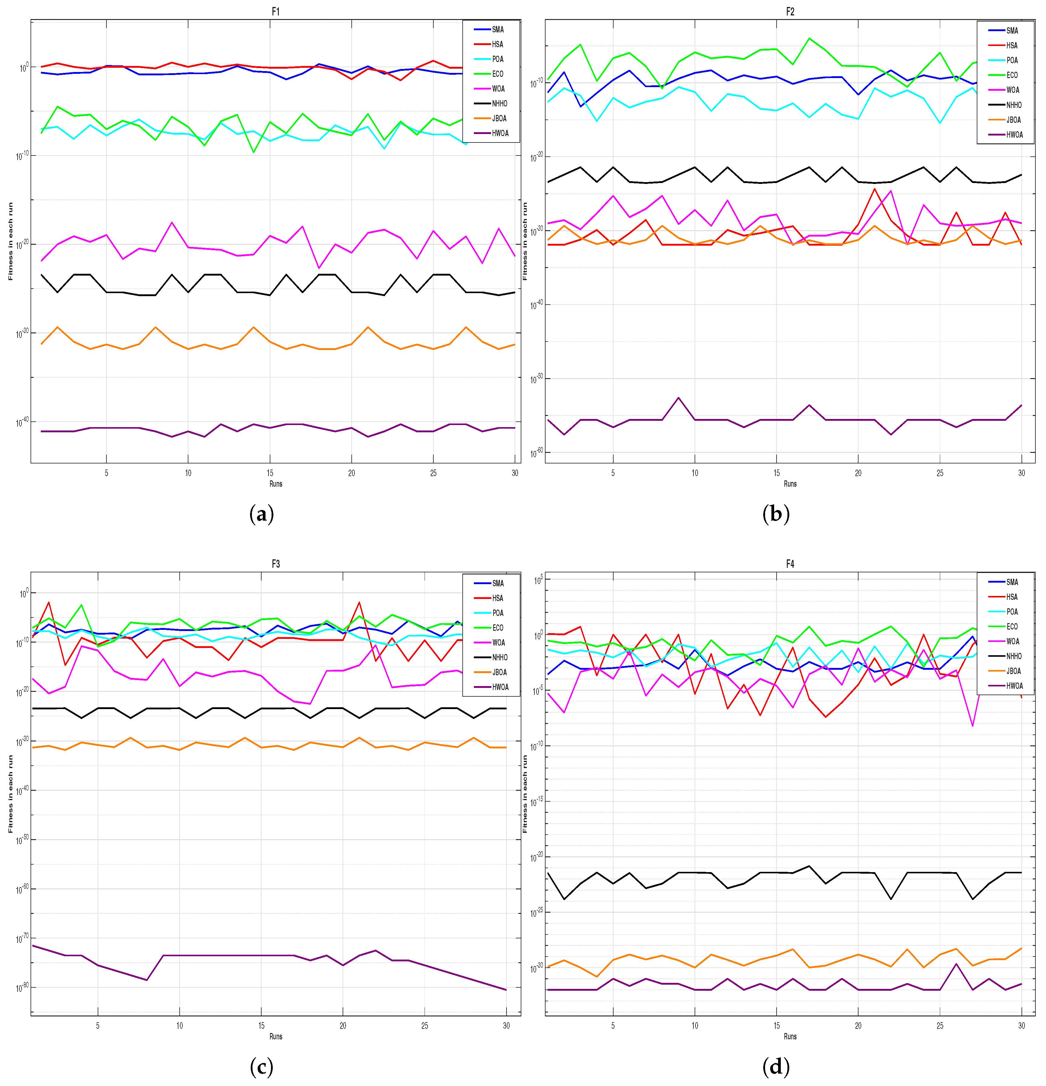 Figure 4 represents the graphical analysis of different problems over multiple runs. It is concluded from the graphs that the fitness in each run in traditional approaches fluctuates, while the proposed method HWOA gives consistent fitness in each run. This makes the proposed method more robust and stable. In