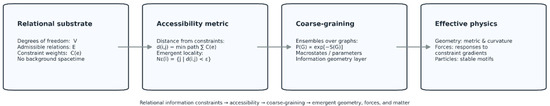 Figure 1 provides a schematic overview of the framework developed in this work. Starting from a purely relational substrate defined by degrees of freedom and constrained informational relations, an accessibility metric is induced from minimal constraint cost. Coarse-graining over relational configurations then yields effective geometric and dynamical descriptions, in which curvature, interaction-like forces, and particle-like excitations arise as emergent, representational structures rather than fundamental entities.