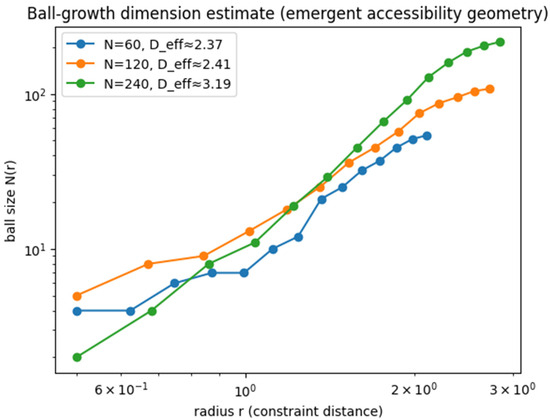 Important note (interpretation). The numerical value of Deff depends on ensemble choice and finite-size effects; the robust feature is the emergence of a scaling regime in which a meaningful slope can be estimated without assuming an embedding space.